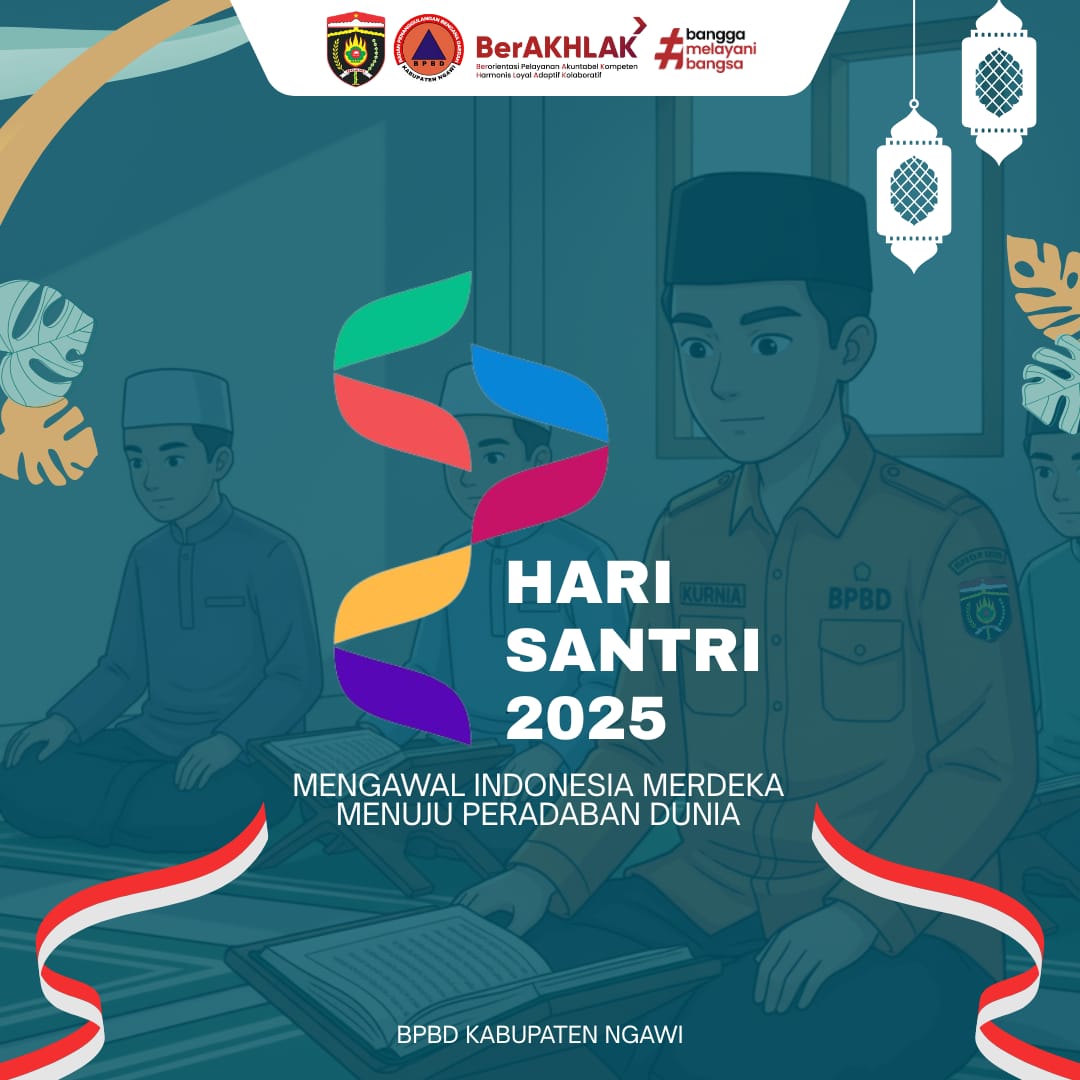 Ngawi, 22 Oktober 2025 – Badan Penanggulangan Bencana Daerah (BPBD) Kabupaten Ngawi mengucapkan Selamat Hari Santri 2025 kepada seluruh santri di Indonesia, khususnya di Kabupaten Ngawi. Momentum ini menjadi pengingat akan peran besar para santri dalam menjaga nilai-nilai kebangsaan, memperjuangkan kemerdekaan, serta membangun peradaban bangsa yang berlandaskan akhlak, ilmu, dan keikhlasan.
