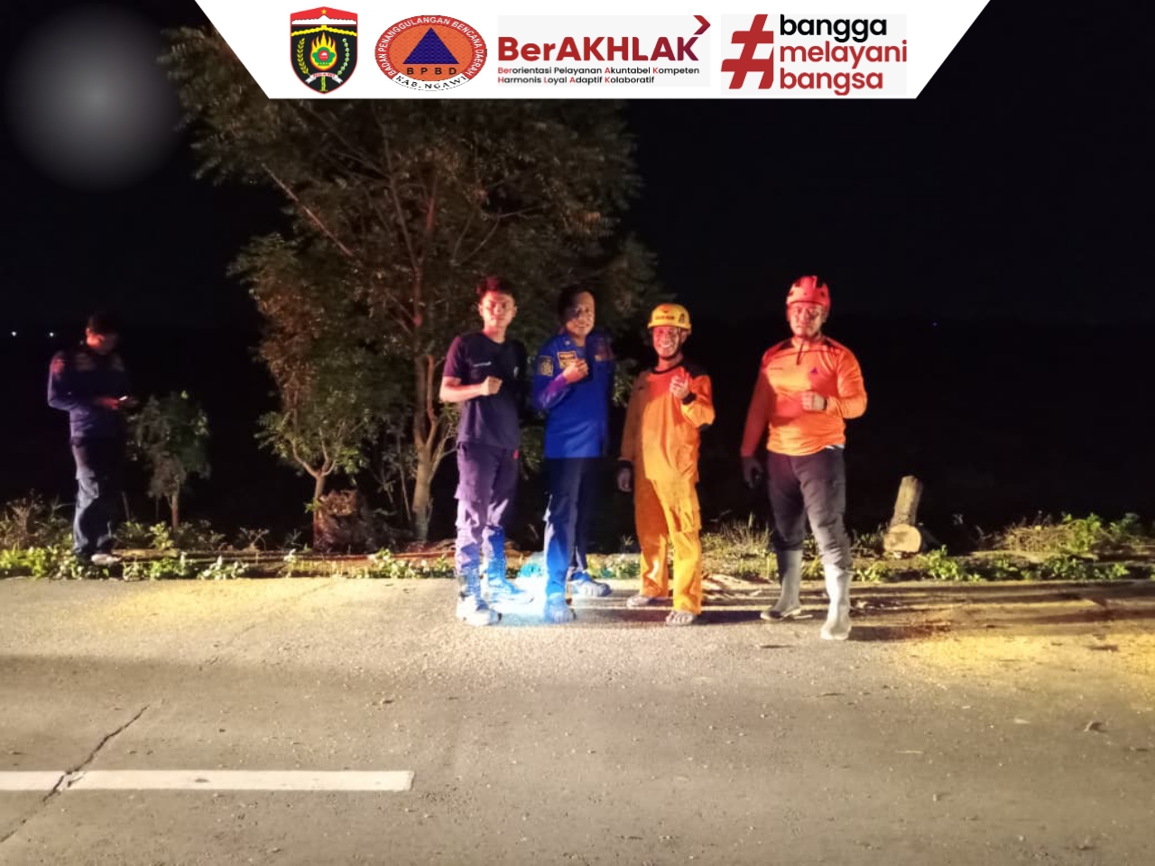 Mengetahui peristiwa tersebut, warga sekitar segera melaporkan kejadian kepada perangkat desa dan Badan Penanggulangan Bencana Daerah (BPBD) Kabupaten Ngawi. Tim Reaksi Cepat (TRC) BPBD Ngawi bersama aparat desa dan warga kemudian melakukan upaya penanganan dengan memotong dan menyingkirkan batang pohon yang melintang di jalan.